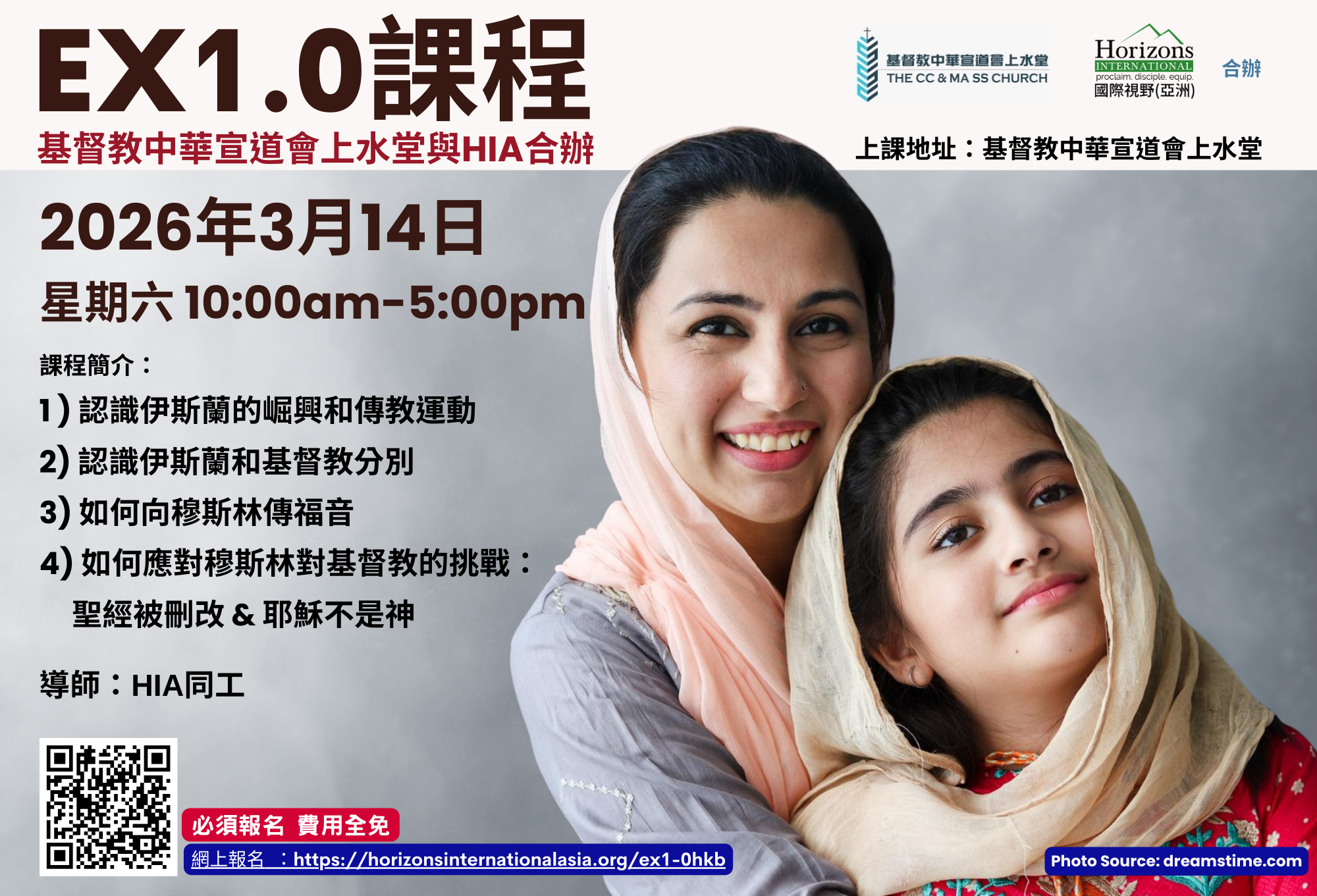 - 課程免費,學員必讀課本 : 「接觸穆斯林」George Houssney, HIA出版 ,基道書樓有售。英文有Kindle版 : “Engaging Islam”