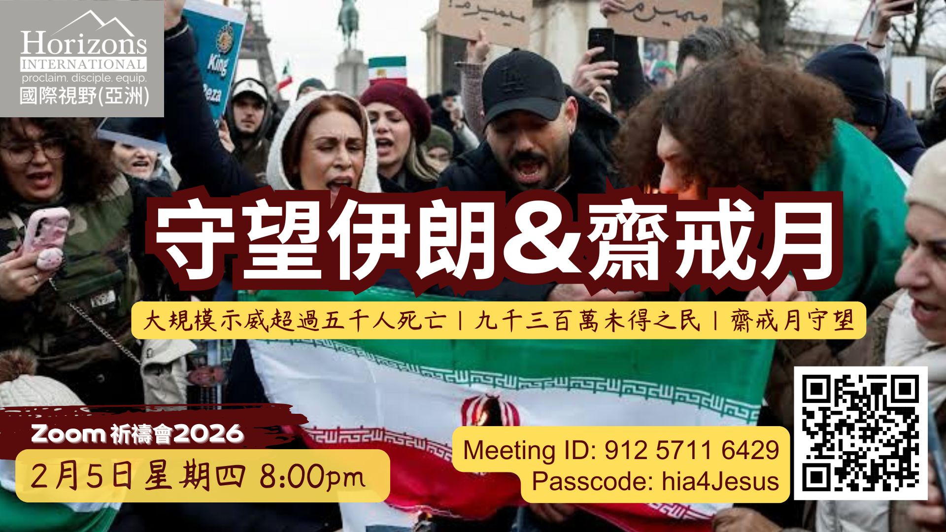 Horizons International (Asia) 國際視野 (亞洲) HIA月禱會 守望伊朗&齋戒月 日期:2月5日星期四晚 8:00-9:00pm Zoom見! Meeting ID: 912 5711 6429 Passcode: hia4Jesus 歡迎你們的參與 Welcome to join us 姓 Family Name: 名 First Name: 聯絡電話 Telephone: 電郵 Email address : 教會名稱 Your Church Name : 毋需報名,歡迎基督徒參加 毋需報名,歡迎基督徒參加 5/Feb 月禱會 (週四) 8pm (HK time) 守望伊朗&齋戒月 備註或留言 Leave a Message : 傳送 Submit