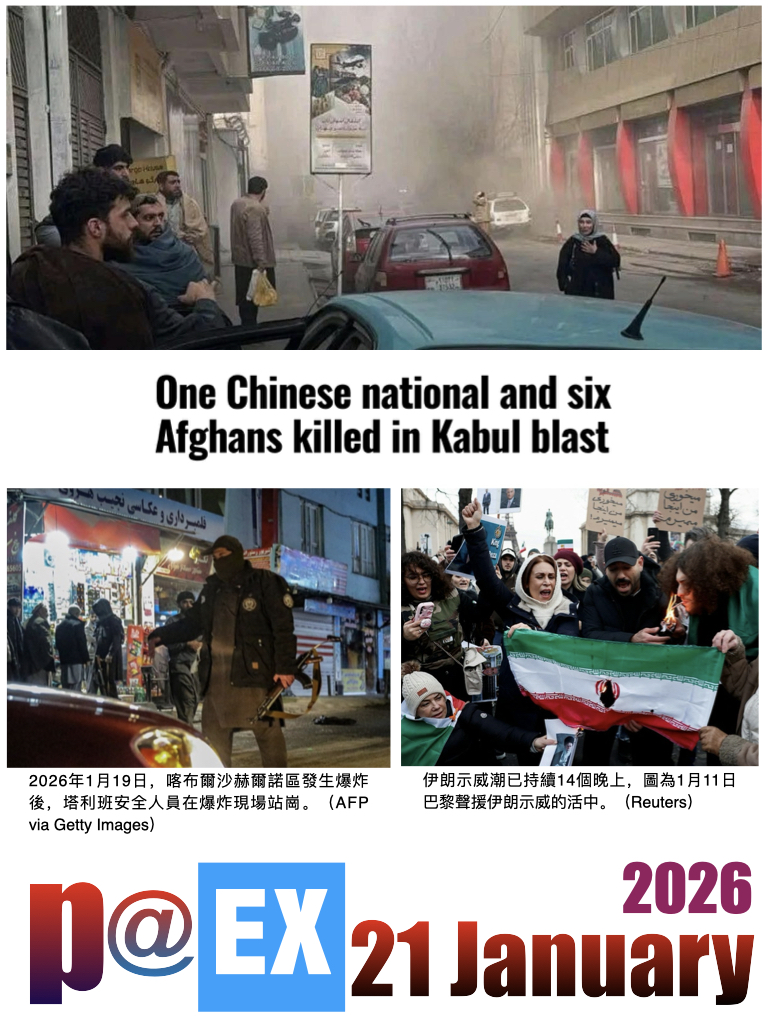 -阿富汗首都喀布爾爆炸案死者包括1名中國穆斯林公民、6名阿富汗人,5名中國人受傷。襲擊者引爆炸彈背心。中方敦促塔利班保護在阿富汗的中國公民與投資,並否認有關維吾爾人權的指控。